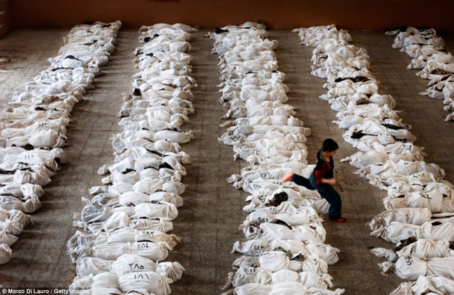 बग्दालको दक्षिण पश्चिम शहर मुसायिबमा शबहरुको भिडबाट भाग्दै एक बालक । शवहरुलाई अन्त्येष्टीका लागि त्यहाँ राखिएको थियो ।